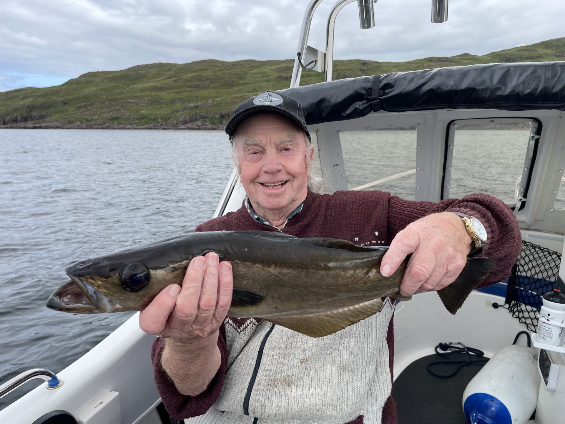 ‘Goldie’ is a 17.5’ (5.3m) fast fisher-type boat. Built in UK by Warrior Boats Ltd., fitted with a Mercury 100Hp main engine and 5Hp auxiliary backup. Top speed is 32kt (37mph).